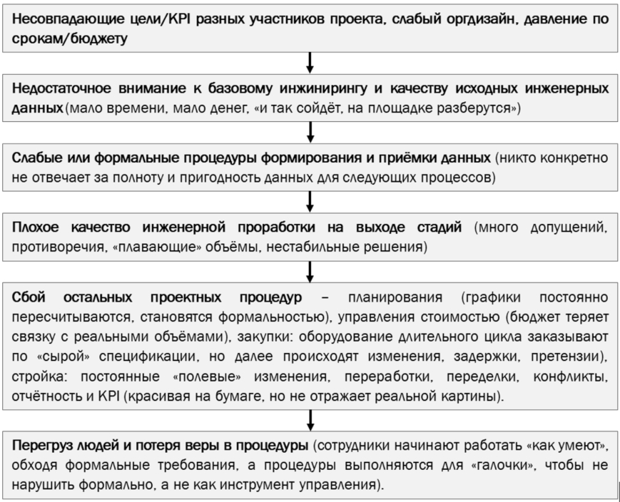 - Если проект в ходе инжиниринга недостаточно проработан или имеются противоречив, то данные становятся неполными, несогласованными, часто меняются, а исполнители вынуждены «додумывать» решения, самостоятельно пересчитывать объёмы, компенсировать пробелы личным инженерным интеллектом и опытом.